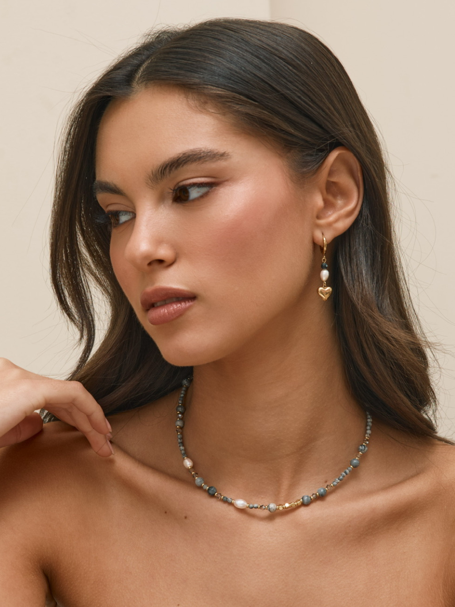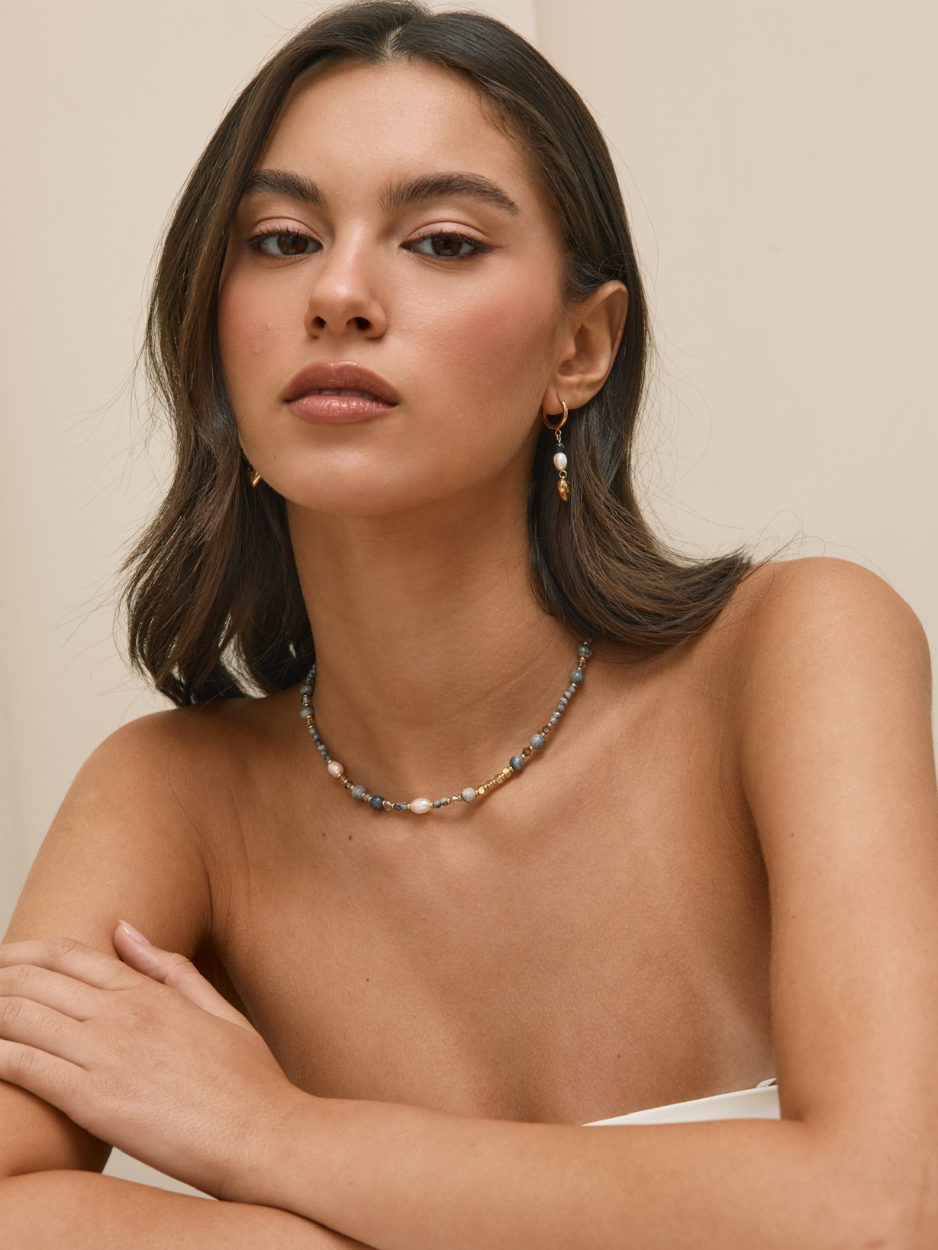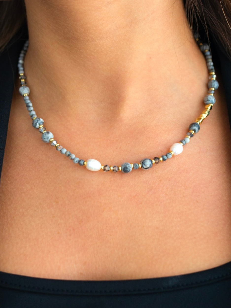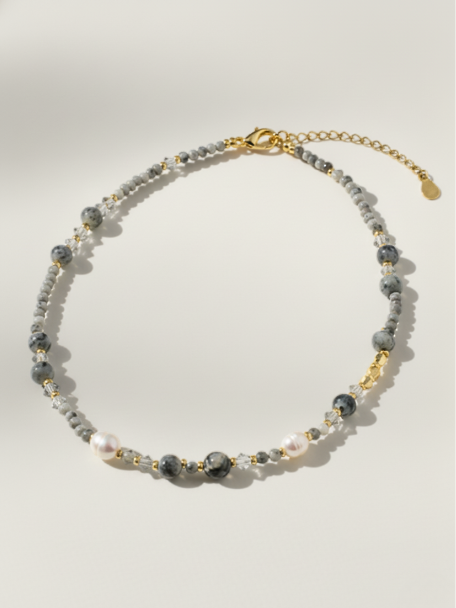שרשרת אבנים מונקו יחודית בשילוב של אבני חן בגוון אפור ופנינים מתורבתות