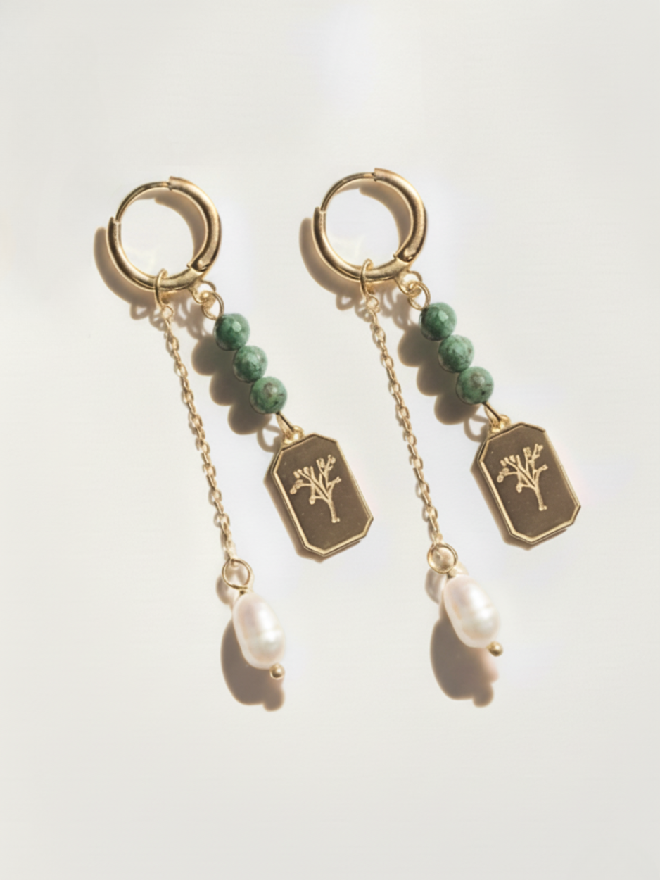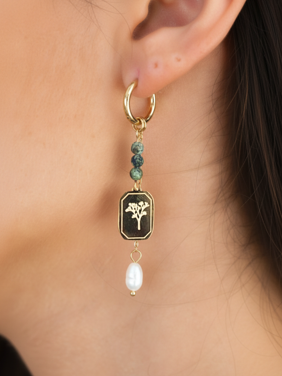 זוג עגילי קלואי המורכב משתי לולאות, אחד עם אבני טורקיז ותליון כלנית מהודר ואחד נוסף עם פנינה מתורבתת