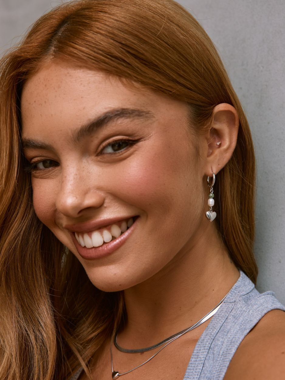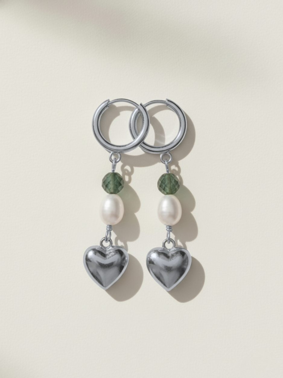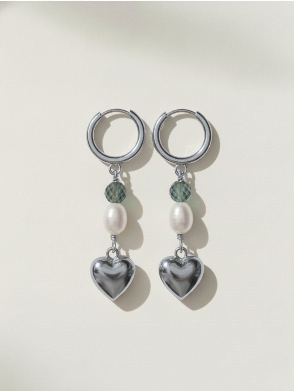 זוג עגילי קלואי לב כסף בשילוב פנינה, אבן חן בגוון טורקיז, ותליון לב עדין