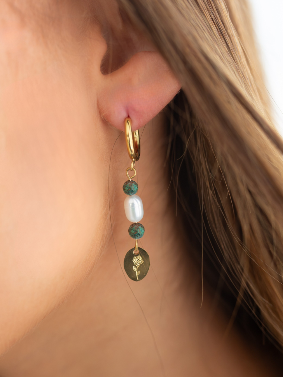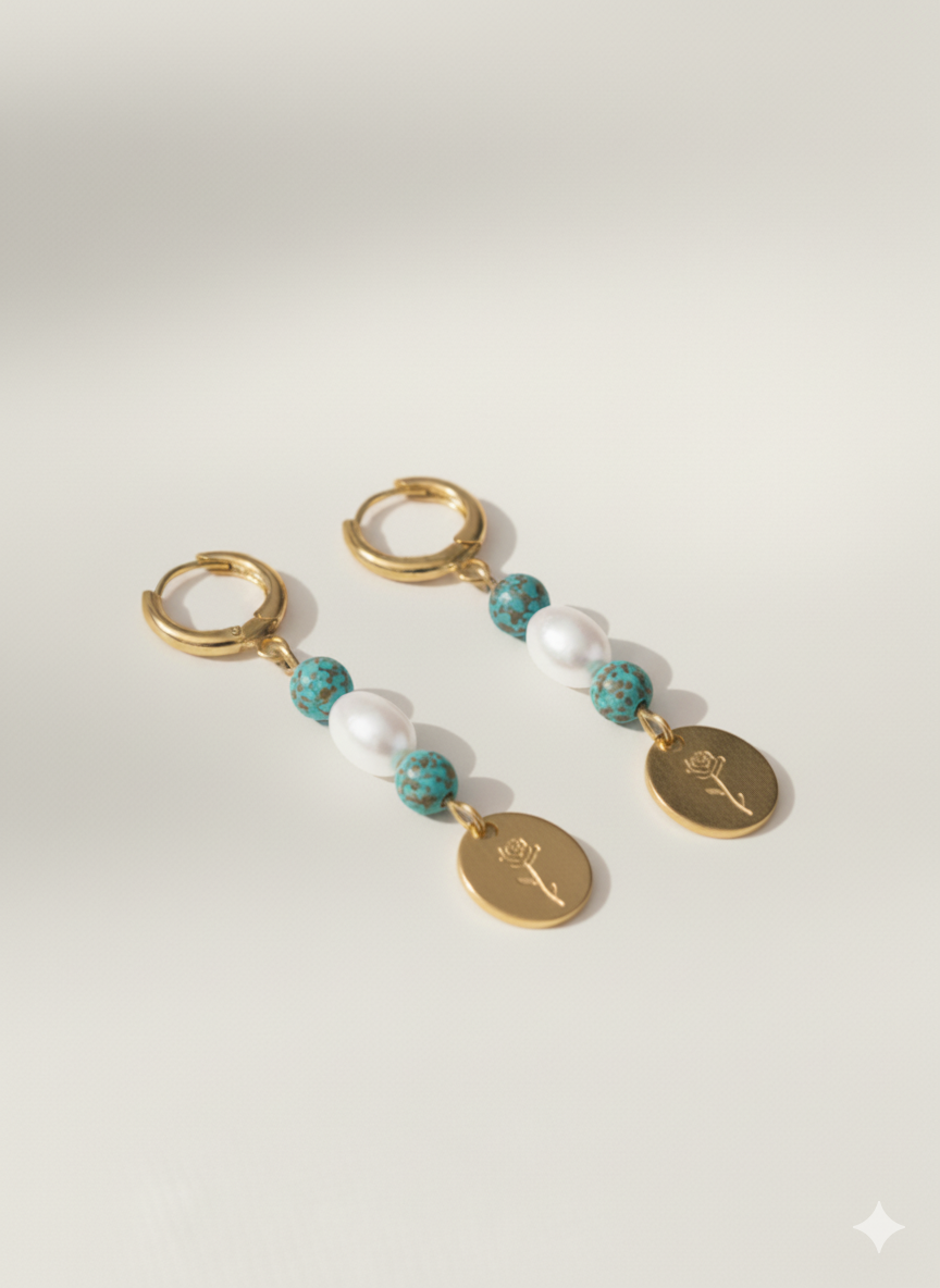 זוג עגילי זהב מקולקציית קלואי, עם חרוזים בגווני טורקיז עם תליון וחריטה של פרח ורד