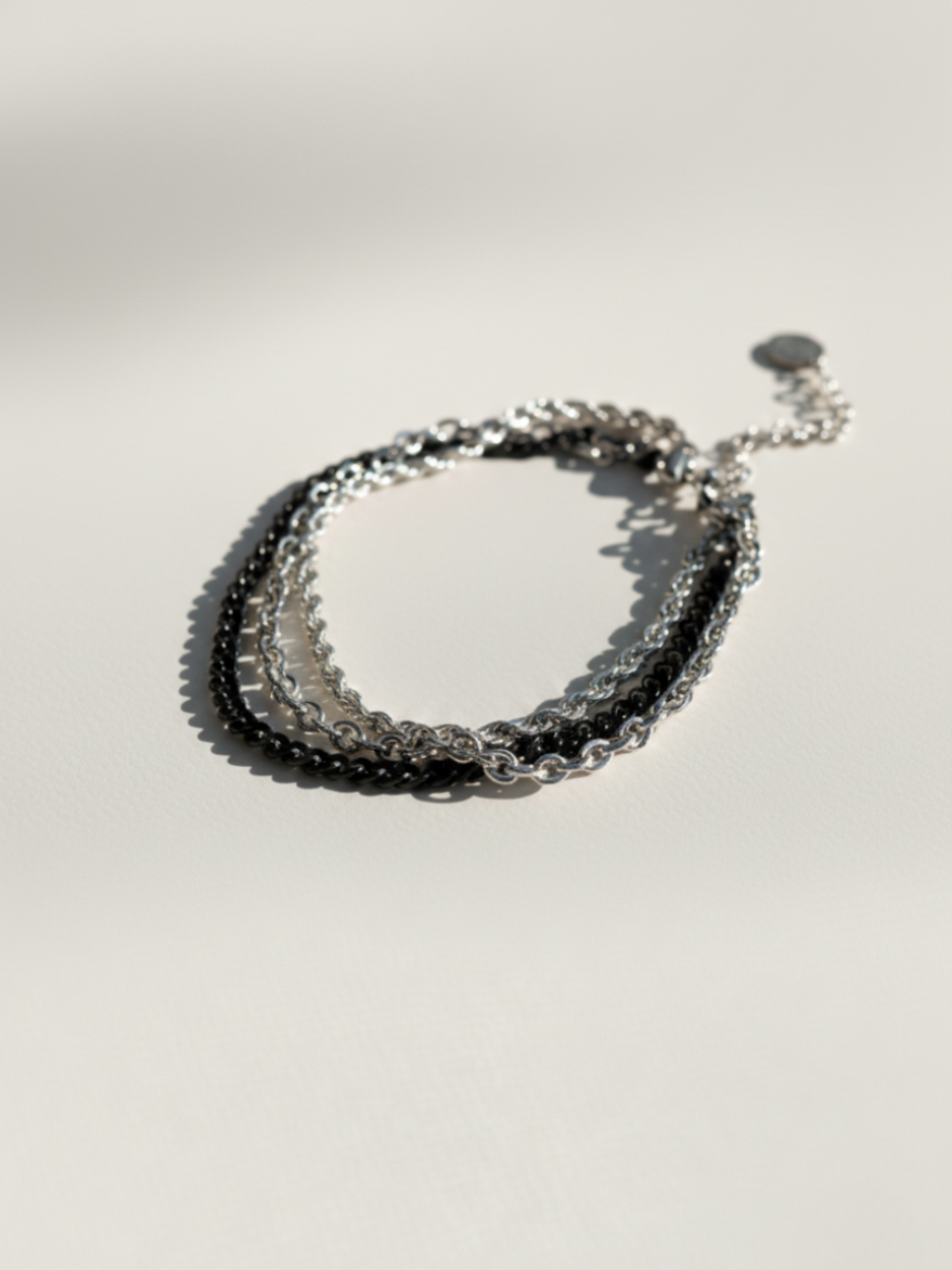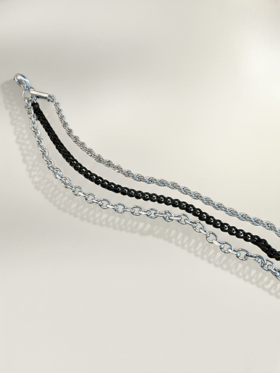 צמיד טריפל תומאס המורכב מ 3 צמידים מחוברים, צמיד חבל, צמיד גורמט עדין מושחר, וצמיד לולאות עדין,