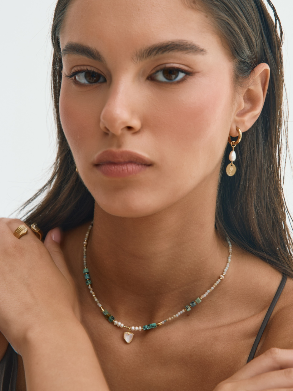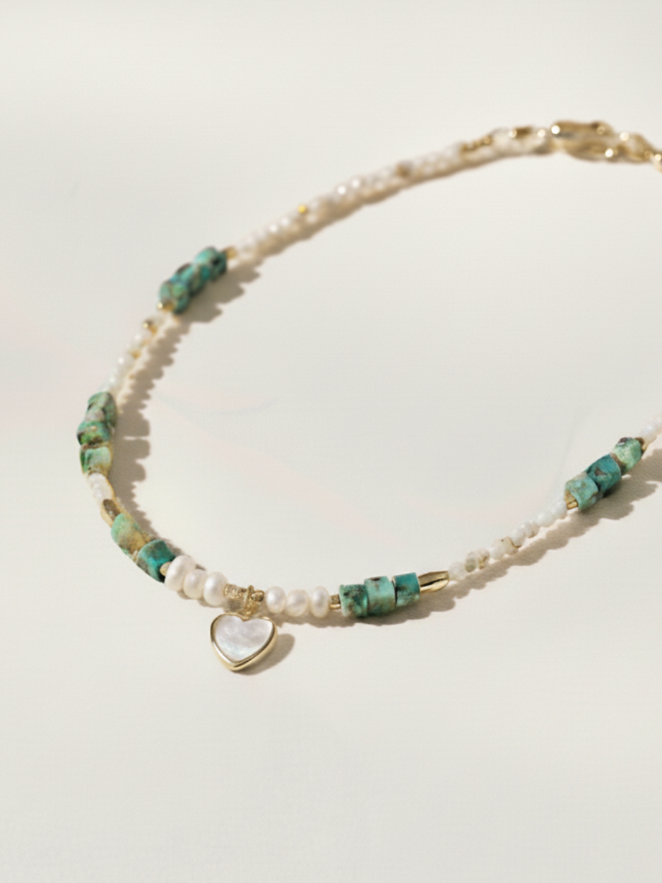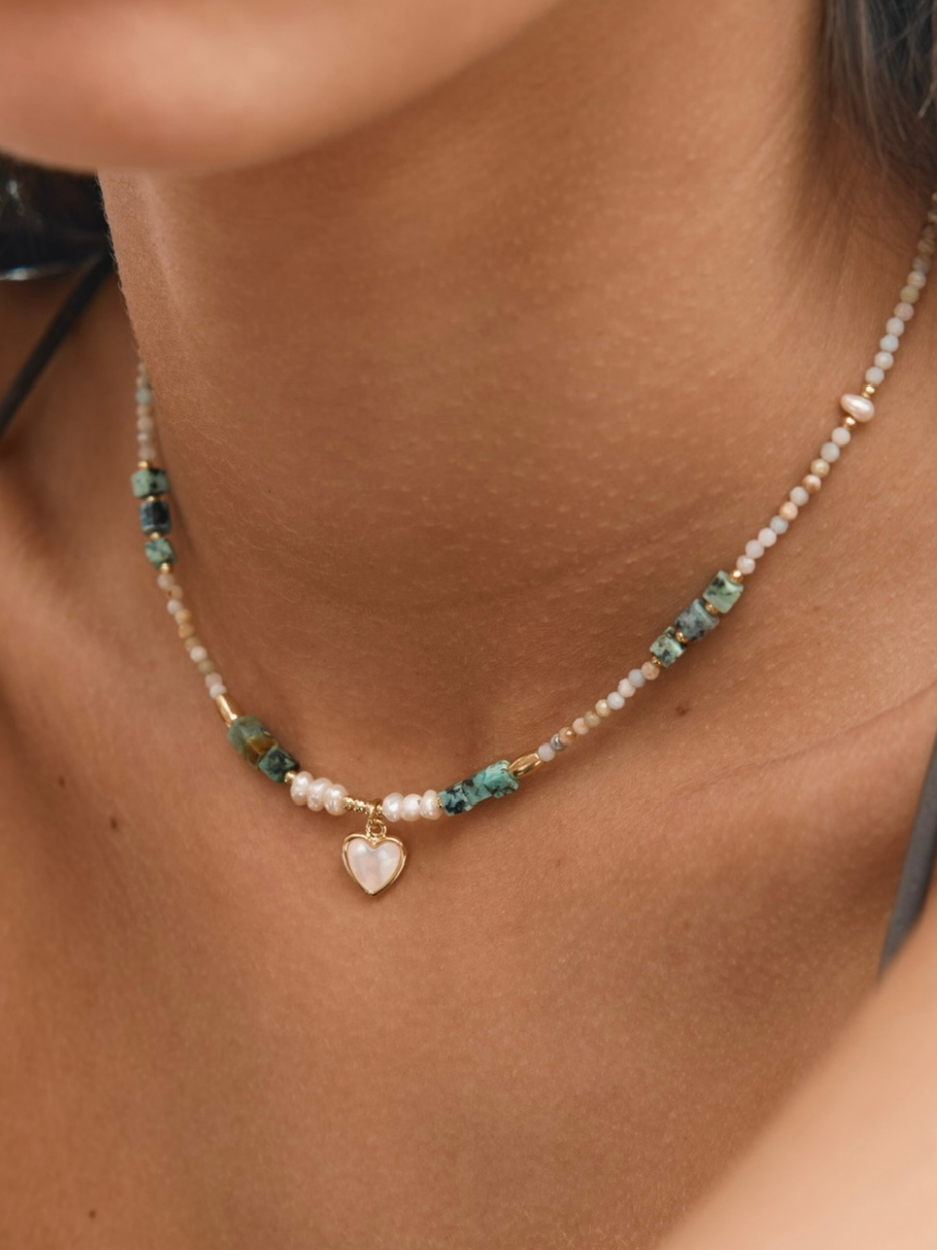 שרשרת חרוזים בשילוב פנינים ותליון לב יחודי שחלקו הפנימי עשוי פנינה