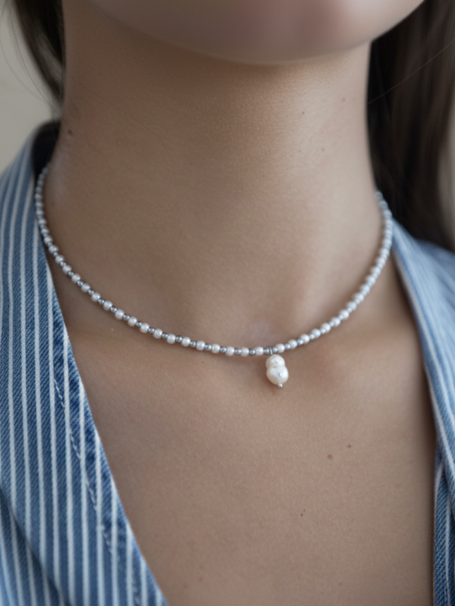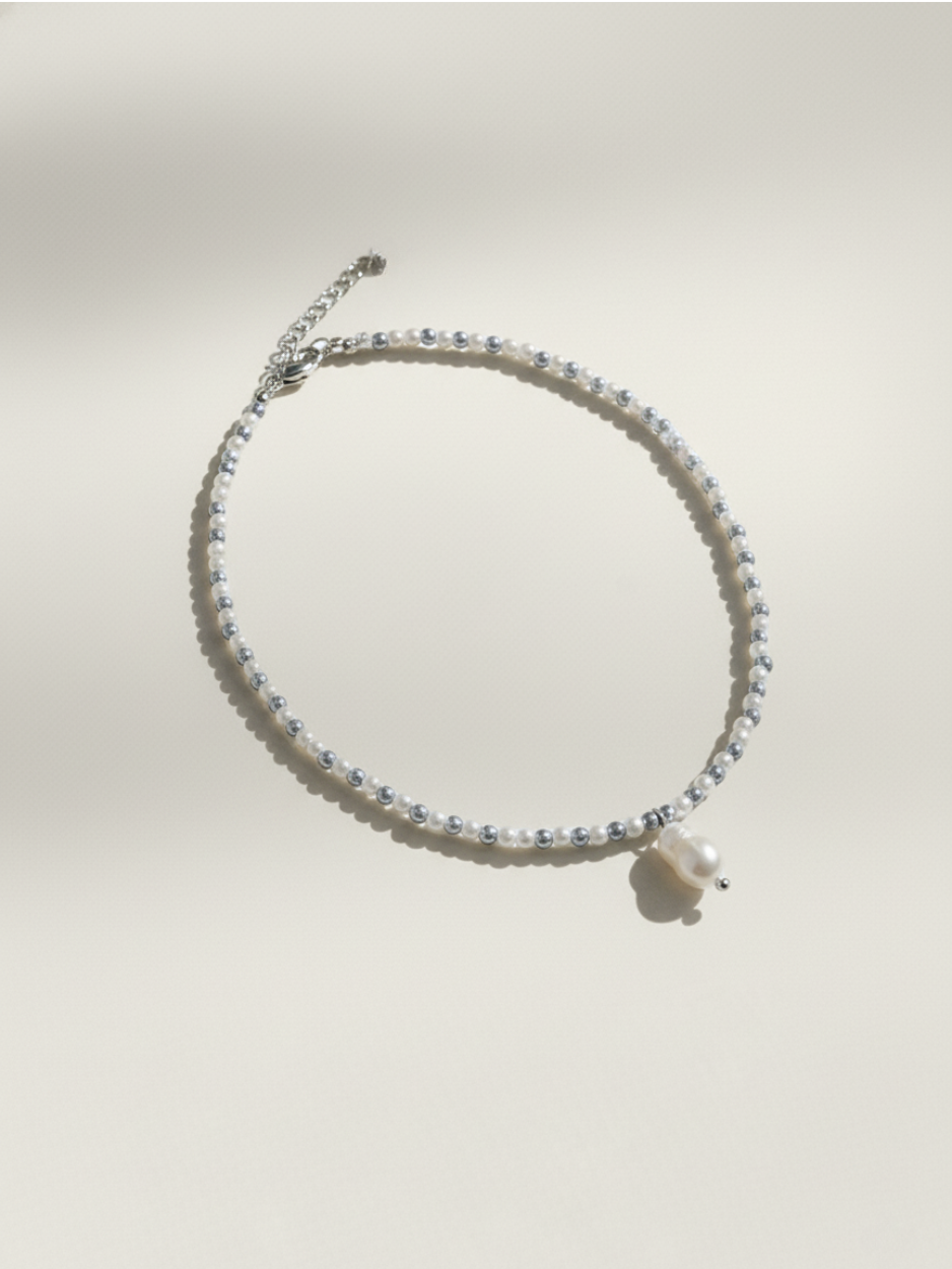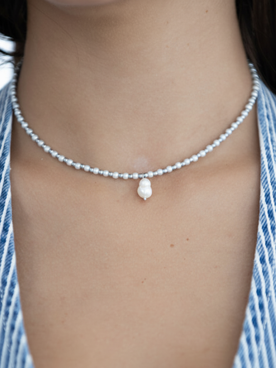 שרשרת פנינים בשילוב חרוזים כסף עם תליון פנינה מהודרת