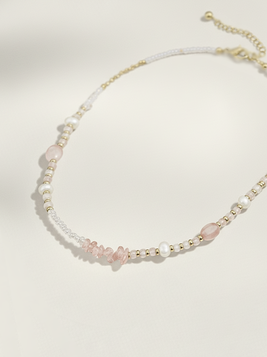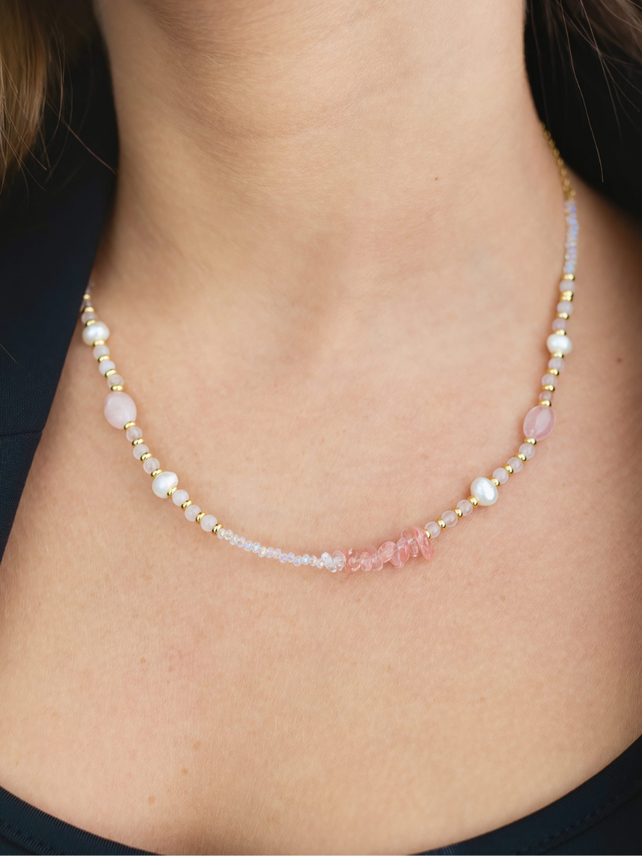 שרשרת אבנים ורודה בשילוב פנינים ואבני חן יחודיות וחרוזי זהב
