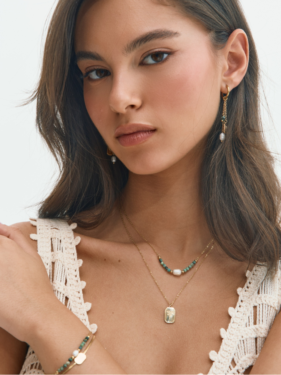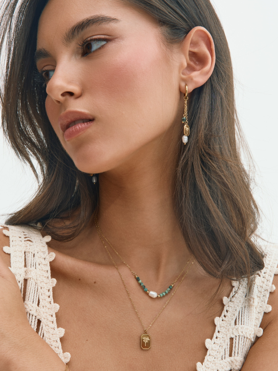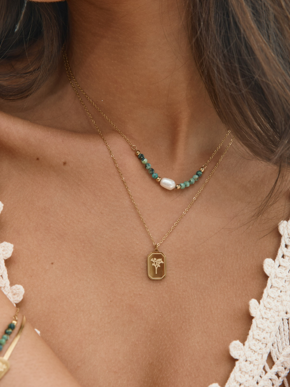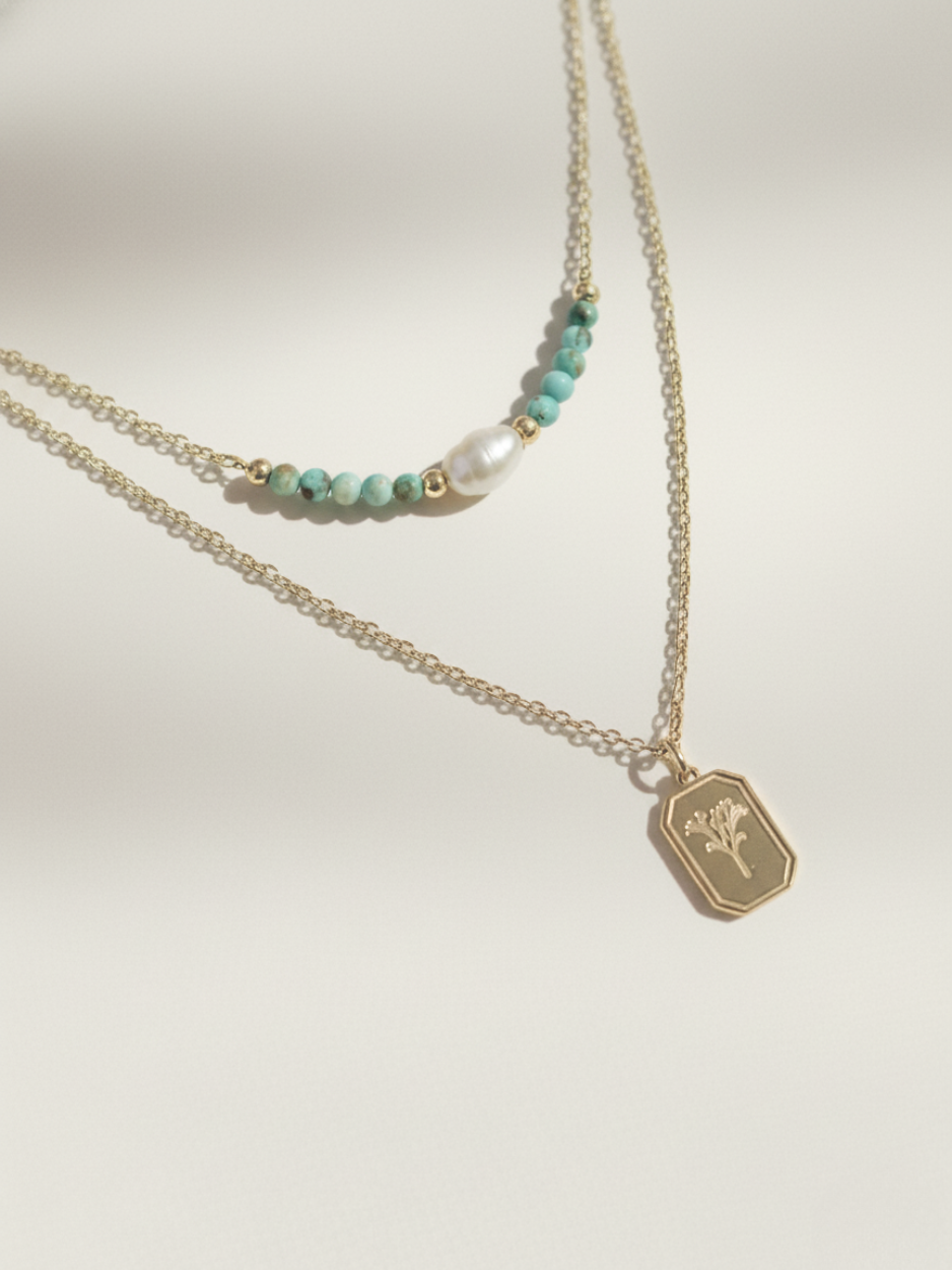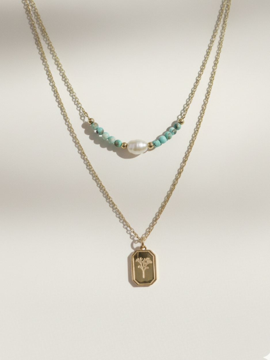 שרשרת קלואי כפולה זהב עם חרוזי טורקיז ופנינה מתורבתת בשילוב תליון כלנית (יכול להגיע עם תליון מרובע או בצורה יותר עגולה) ניתן לבחור בין התליונים בעת כתיבה בהערות מה התליון הנבחר
