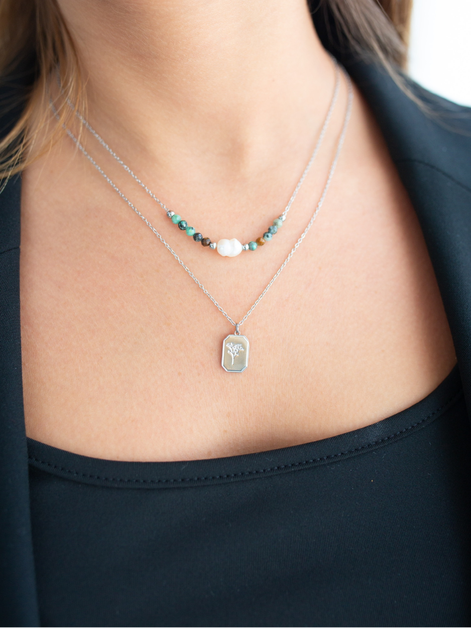 שרשרת קלואי כפולה כסף בשילוב יחודי חרוזי טורקיז ופנינה מתורבתת ותליון כלנית.