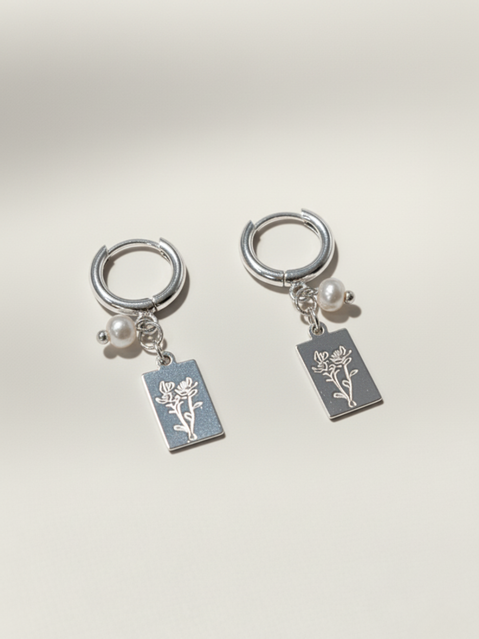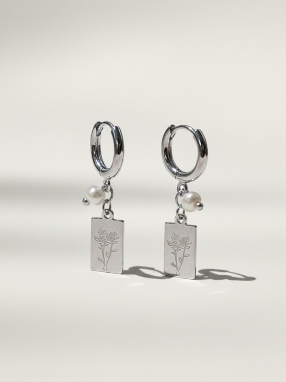 זוג עגילי כסף בשילוב תליון מהודר עם חריטת ורדים ופנינה מתורבתת זעירה