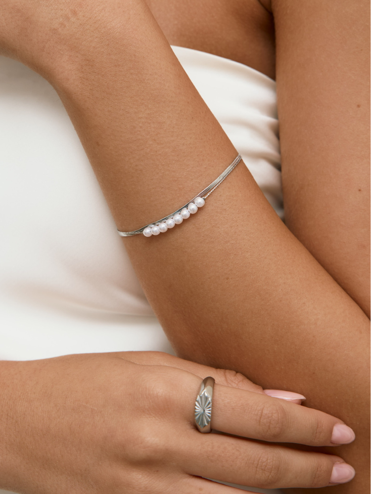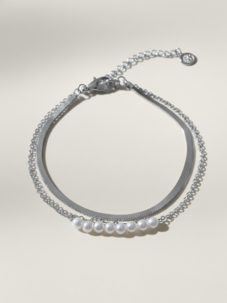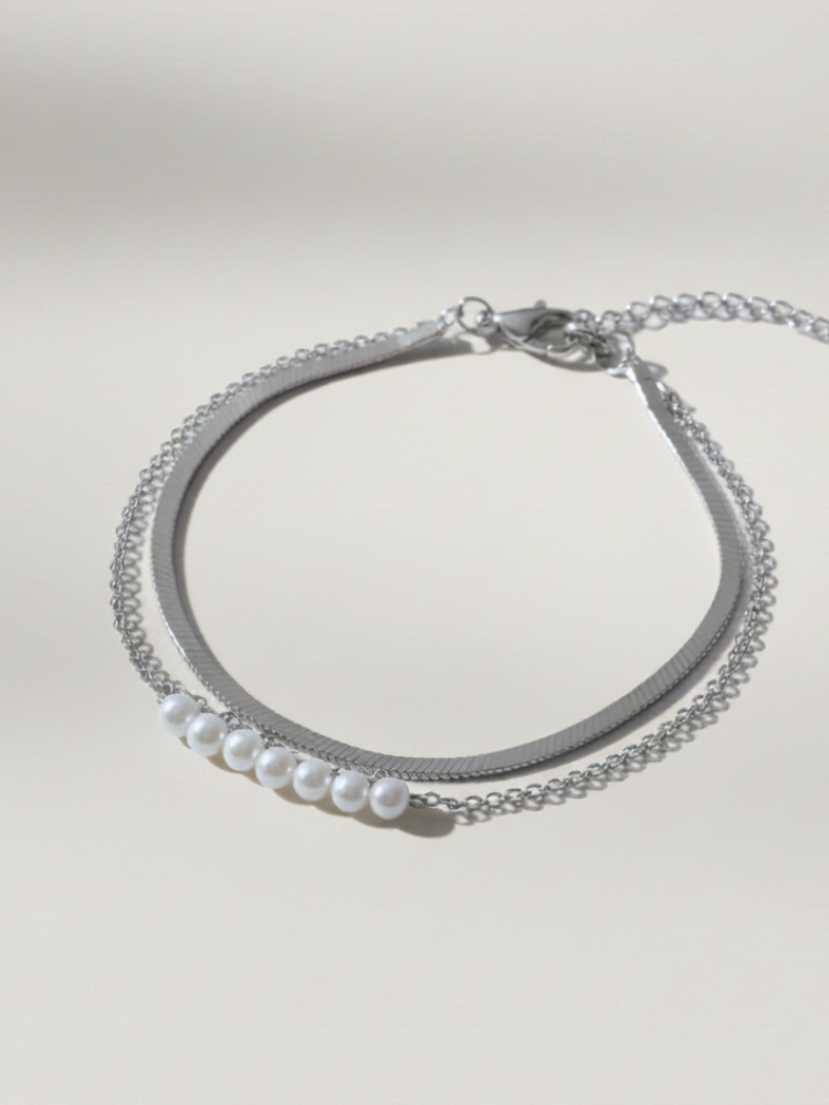 צמיד מיי כסף כפול המורכב משני צמידים, צמיד נחש וצמיד כסף עדין בשילוב פנינים מתורבתות
