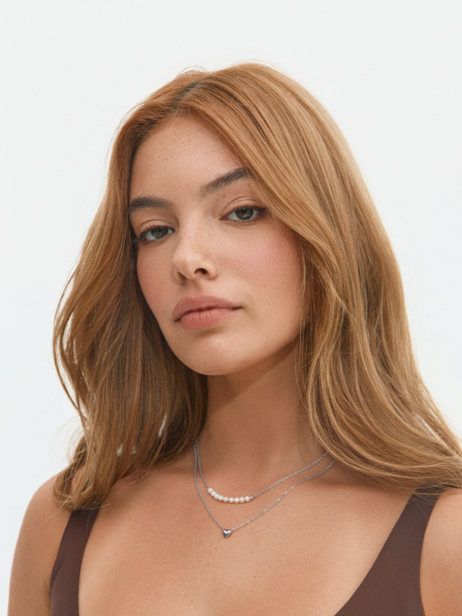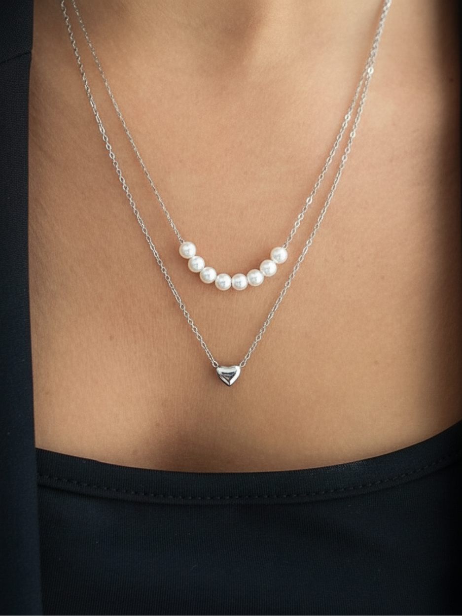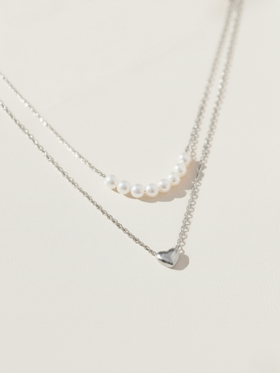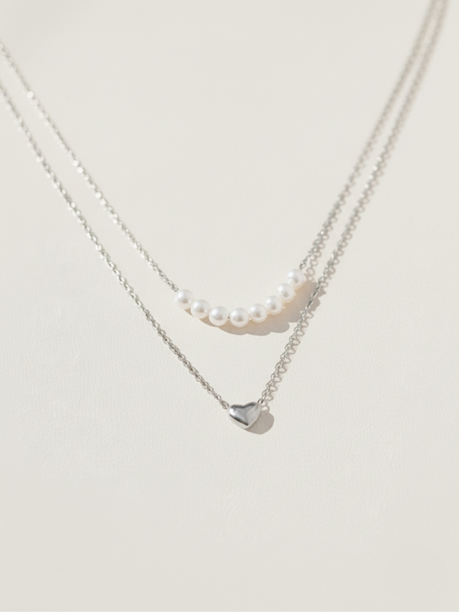 שרשרת כסף עדינה כפולה בשילוב פנינים מתורבתות ותליון לב